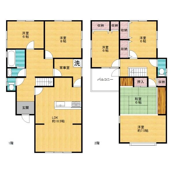 | 設備・サービス | 18帖以上 全居室6帖以上 都市ガス 室内物干し フローリング クッションフロア ダウンライト 24時間換気システム シューズボックス 上水道公営 下水道 |